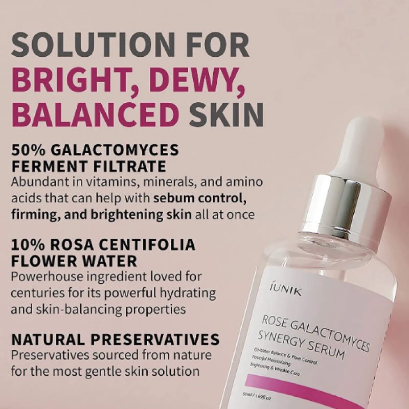 The iUNIK Rose Galactomyces Synergy Serum is a highly moisturising serum that balances, controls excess sebum, targets enlarged pores and brightens the skin. Made with 50% Galactomyces ferment filtrate to lift and control the skin’s oil content, and 10% Rose Water to moisturise and balance the skin. Niacinamide and adenosine is also present to boost the brightening and anti-wrinkle effects.